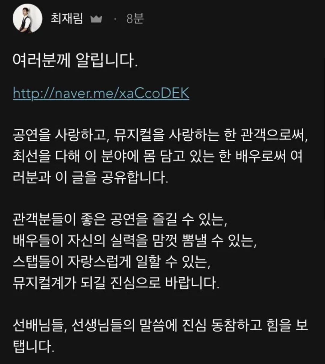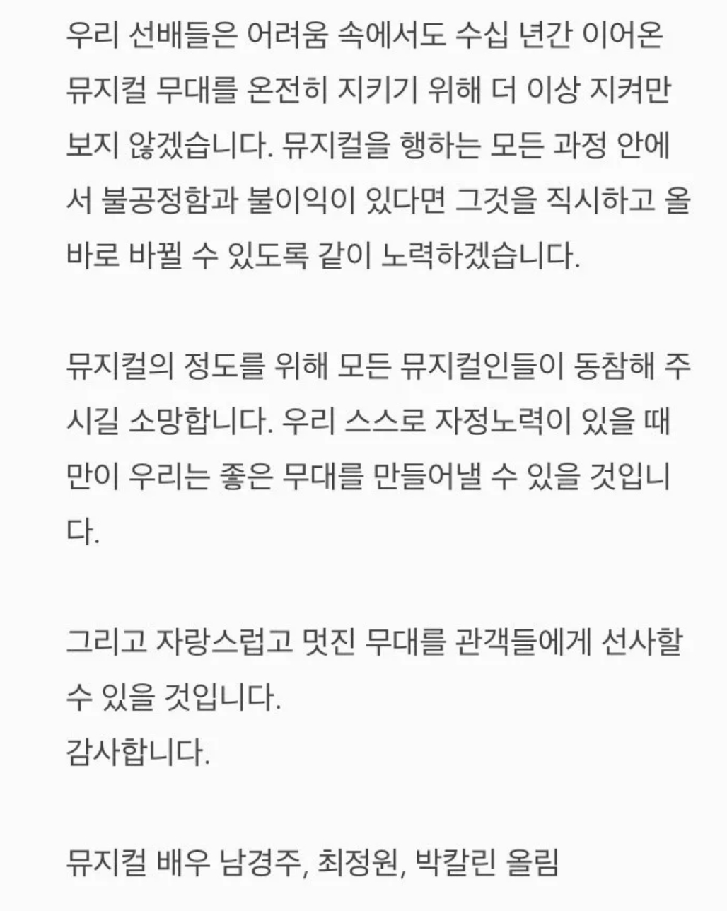 그리고.. 뮤지컬 모르는 사람들도 대충 얼굴은 알 정도로 유명한 1세대 뮤지컬 배우들이 호소문을 올림
