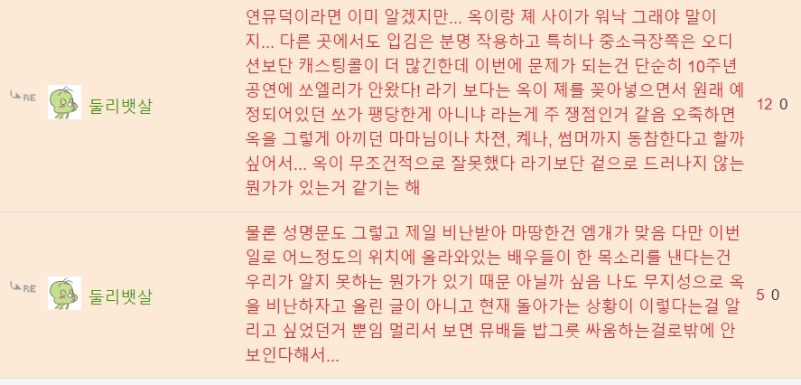 댓글 분위기들도 옥주현에 대해 딱히 여론이 좋진 않음
